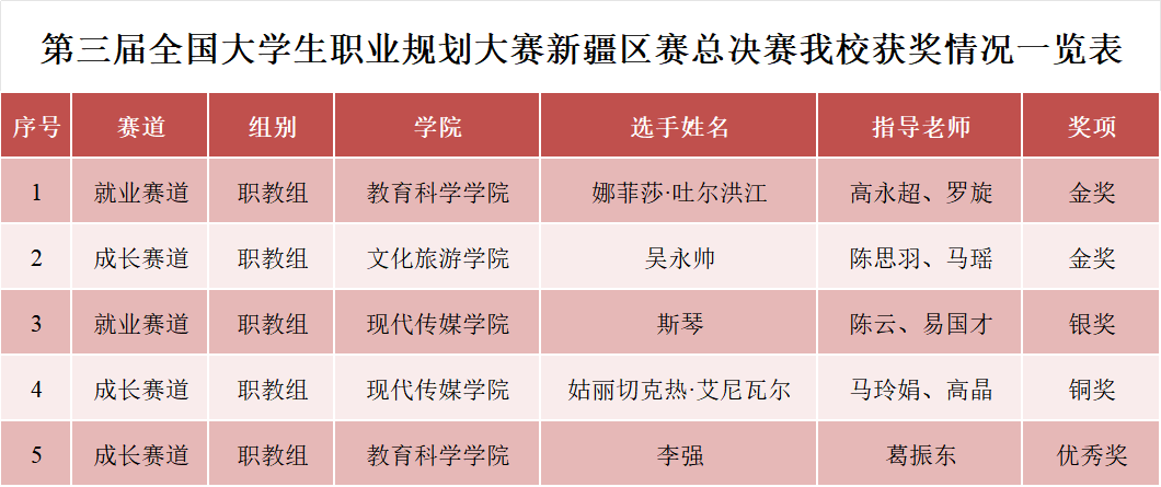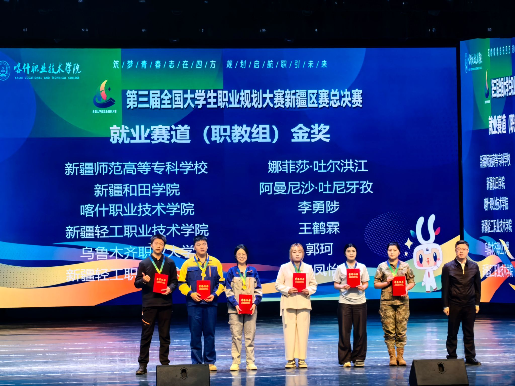3月19日,第三届全国大学生职业规划大赛新疆区赛总决赛在喀什职业技术学院圆满收官。经过现场激烈角逐与专业评审团严格考评,我校5名参赛选手凭借扎实的专业素养、清晰的职业规划构思与出色的现场综合表现,斩获2项金奖、1项银奖、1项铜奖及1项优秀奖。值得一提的是,我校已连续两年在该赛事中摘得双金奖,充分彰显了学校在大学生职业规划培育领域的扎实积淀与显著育人成效。