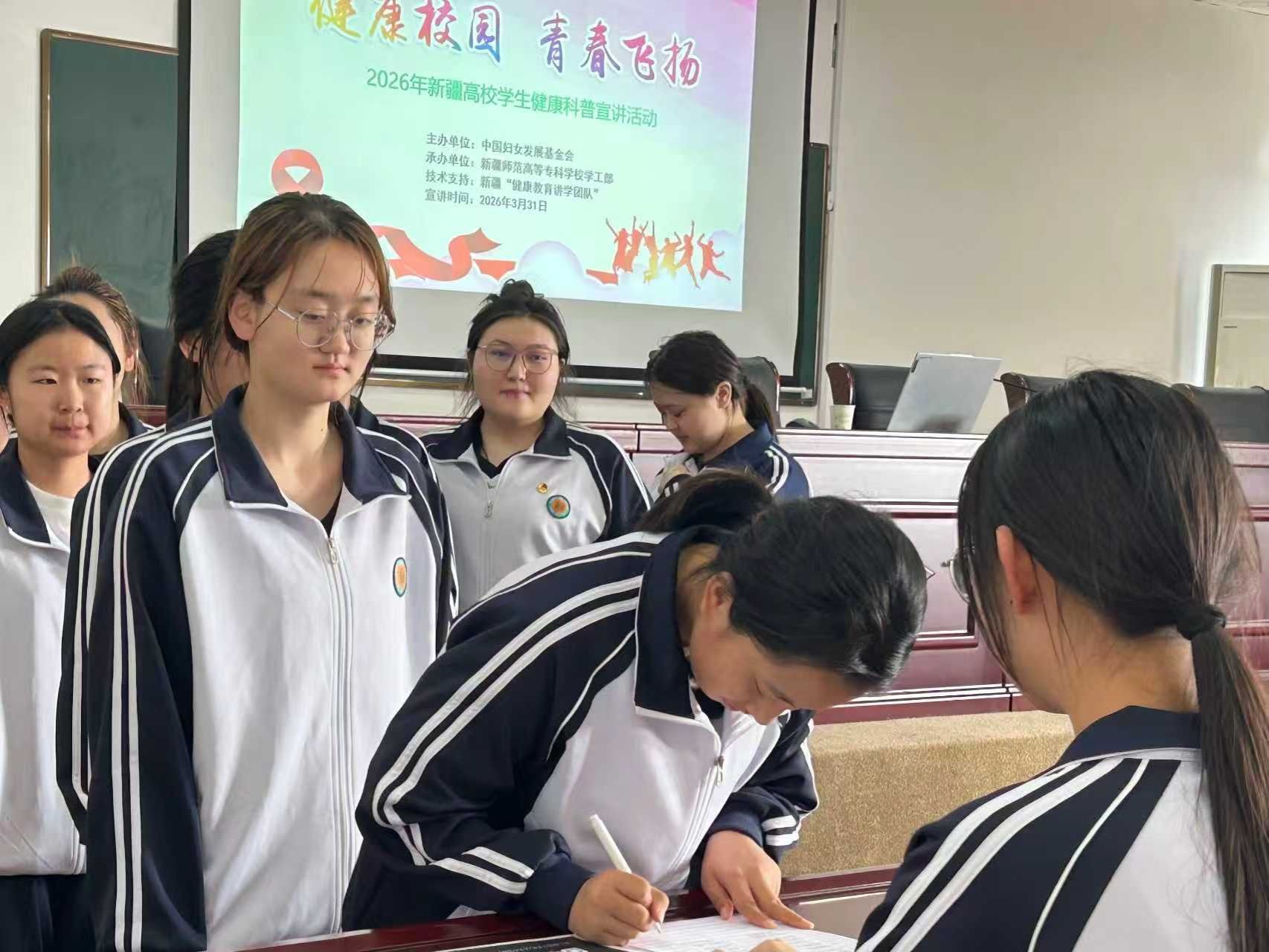 近日,由中国妇女发展基金会主办、我校承办的“中国女性宫颈健康促进计划”健康课堂科普活动于润德楼报告厅成功举办。本次活动特邀乌鲁木齐市计划生育协会秘书长龙春燕、新疆生产建设兵团医院妇产科主任医师王丽丽为在校学生开展宫颈癌相关知识科普活动,旨在提高我校学生对宫颈癌的认知水平和预防意识,活动共计120余名学生参与。