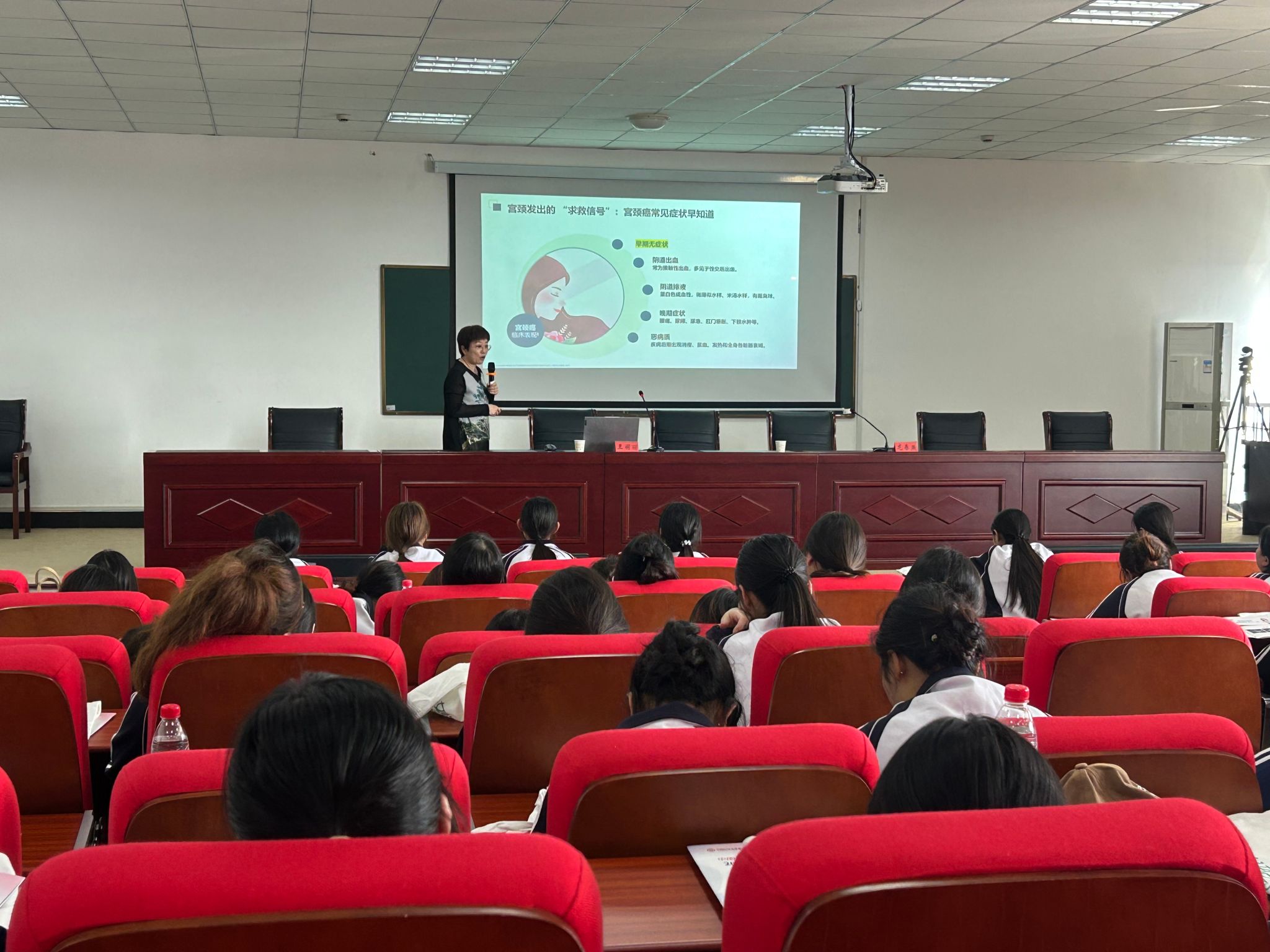 活动伊始,龙春燕老师强调了健康教育的意义与重要性。随后,王丽丽老师从宫颈癌的临床症状及变化特点入手,通过生动的临床案例与自身工作经验,为大学生系统讲解了宫颈癌的三级预防理念,以及HPV疫苗接种前后的注意事项。深入浅出的讲解,引起了在场学生的广泛关注。临近尾声,龙春燕老师呼吁适龄学生要及时接种HPV疫苗,加强自我防护。
