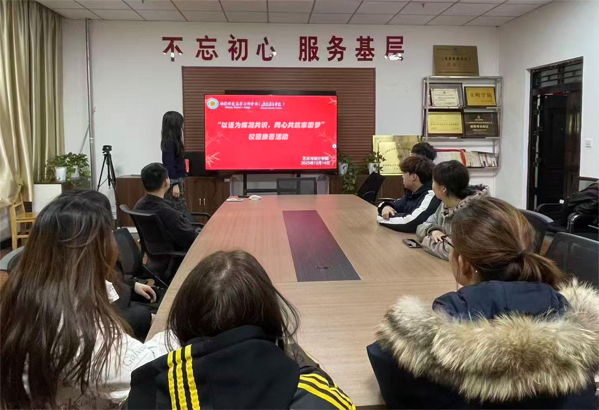 为营造规范和谐的校园语言环境,增强学生语言文字规范意识,促进交流协作,铸牢中华民族共同体意识,12月14日晚,艺术与设计学院于光明校区厚德楼402室、411室同步举办“以语为媒凝共识,同心共筑家国梦”校园推普活动,现场气氛热烈,成效显著。