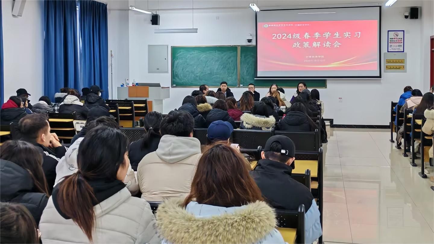 为切实规范学生教学实践管理,明晰实习准入要求,助力学生精准把握实习政策要点,高效推进教育实习工作,12月10日,初等教育学院召开2026春季学期实习政策解读会。学院领导班子、班主任、辅导员及全体实习生参会,精准解读实习核心要求,筑牢学生职业成长基石。